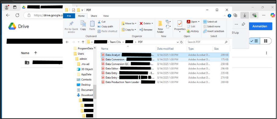 In one example, shown in Figure 2, a user attempted to analyse potentially malicious files hosted on a Google Drive folder. However, the files included CVs likely belonging to prospective or current employees of the organisation. This potentially exposed their personal information as these files were accessed during the analysis. Additionally, a possible internal PowerPoint presentation linked to the organisation appeared in the files.