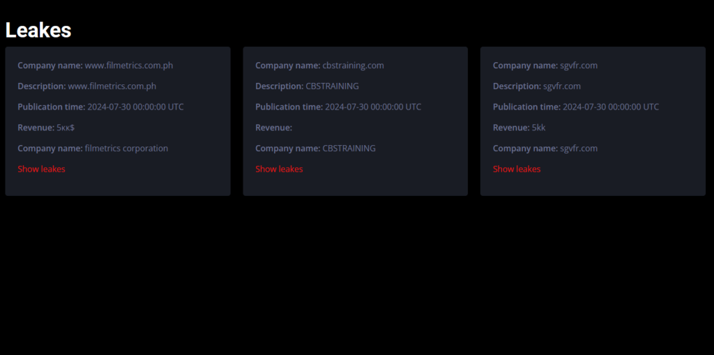 The group first posted on its DLS on 17 July 2024, and has since published a total of seven victims, each containing samples to act as proof of compromise. For several of the listings, a filetree is available to view exfiltrated data. Upon accessing a specific file in the filetree, the site redirects to a cloud storage site potentially operated by the group, from which the data is available.