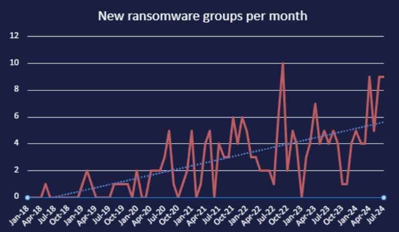 As the threat landscape continues to develop, ransomware and data brokerage groups constantly emerge, develop, and disband. Cyjax observed a relatively high level of data-leak site (DLS) emergence in July 2024, with a total of nine new sites. For reference, the highest observed number of ransomware groups that have emerged in a single month is ten (September 2022).
