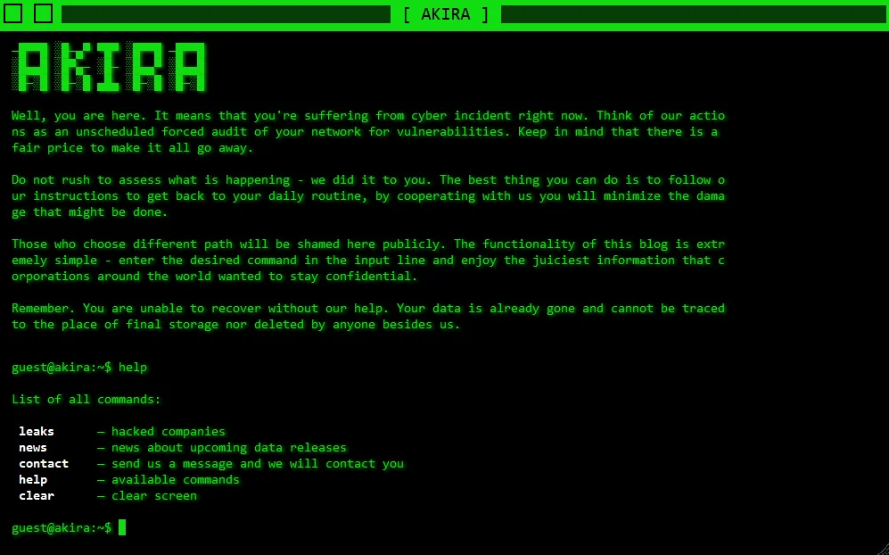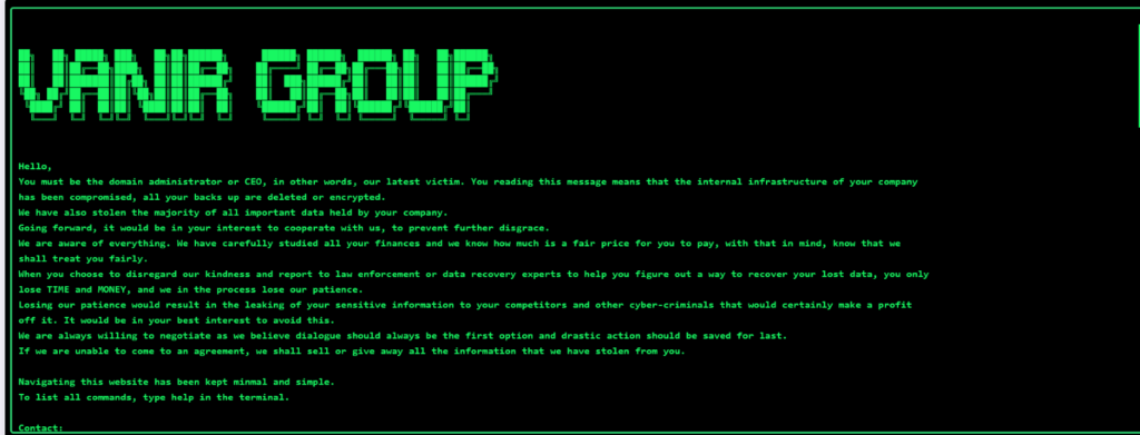 Vanir Group operates a Tor-based DLS that has the appearance of a command-line tool, a style previously used in the Akira ransomware group DLS. As of August 2024, Vanir Group has three victims listed on the site, each stating the alleged date that data was exfiltrated.