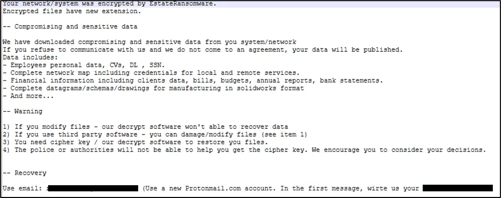 The note may have been copied from another ransomware group, with EstateRansomware erroneously hinting to the existence of a DLS. However, this ransom note indicates that double extortion is being used against the victim, whether real or not. Regardless of the existence of a DLS, the threat of data leakage exists. Therefore, victims would likely be under the impression that data will be leaked upon not paying the ransom, potentially urging payment.