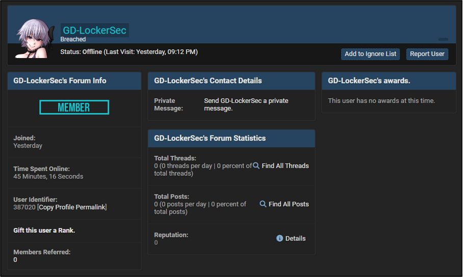 On 23 January 2025, an account with the username ’GD-LockerSec’ was created on the prominent English-language cybercriminal forum BreachForums. At the time of writing, this account has not made any contributions to the forum. Additionally,Cyjax cannot verify whether it is operated by the same entity that operates the GD LockerSec DLS.
