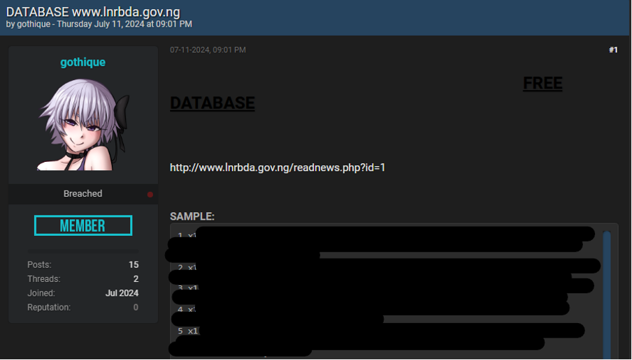 At the time of writing, none of the claimed victims have acknowledged the group’s claims nor announced that they have suffered any recent cyber incidents. However, data allegedly stolen from River Basin Development Authority was shared on BreachForums on two separate occasions in 2024. These posts were created by two different users, thoughis unclear whether these are separate leaks or one and the same. It is also unclear how or whether these are related to GD LockerSec’s claims, or whether the group used the already-leaked information during any attacks it carried out. It is realistically possible that GD LockerSec has obtained this data from BreachFroums and is attempting to pass the leak off as its own.