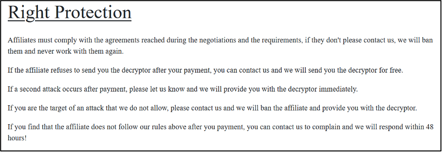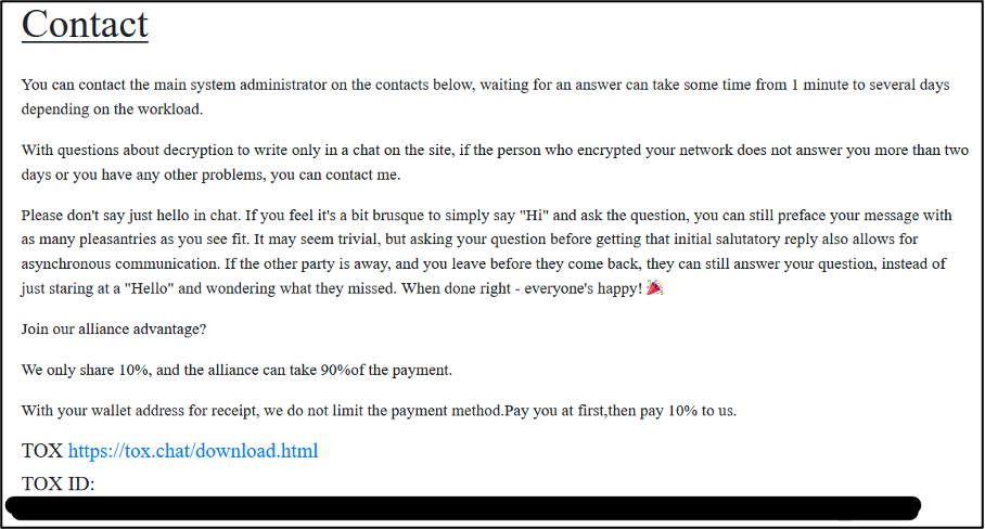 On both the About and Contact pages of the GD LockerSec DLS, the group makes reference to an apparent Ransomware-as-a-Service scheme. Here,it promises that affiliates will receive 90% of ransoms paid by victims, with GD LockerSec keeping the remaining 10%. Such wording is typical of RaaS advertisements. However, further details of such a scheme are unavailable.