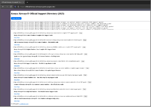 By going directly to the domain, the structure of the sites can be observed. Each one starts with a directory containing links to 10 additional fake help pages hosted on the domain. The domain uses a number of different keywords and variations on the support information. An example of this root domain targeting Kenya Airways can be seen below in Figure 2.
