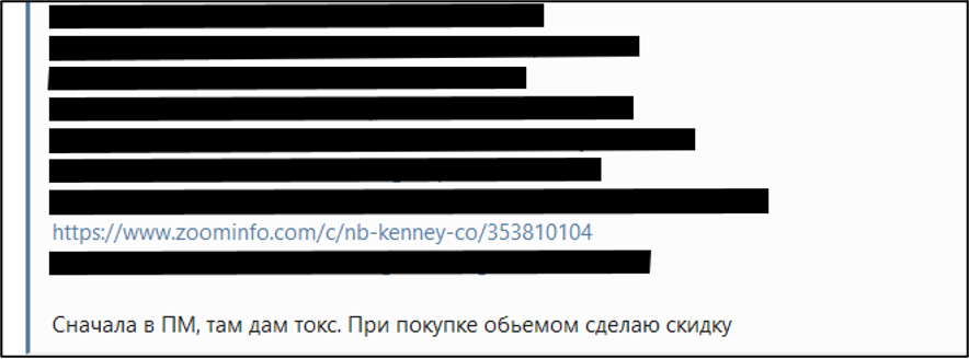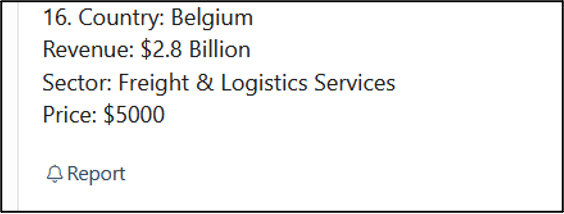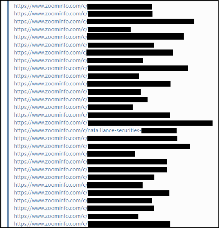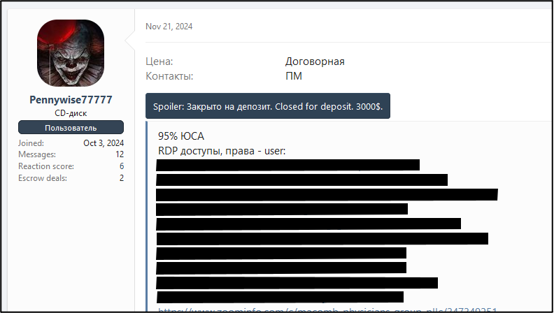 On 21 November 2024, Pennywise77777 posted a thread on a prominent Russian-language cybercriminal forum, advertising access to 96 different organisations across several sectors and geographies. The broker shared each access by posting links to organisations’ ZoomInfo page. ZoomInfo is a business-to-business (B2B) organisation which catalogues company information and shows geography, sector, employee count, and more information about a company. It is a service commonly used by IABs to produce this information in listings.