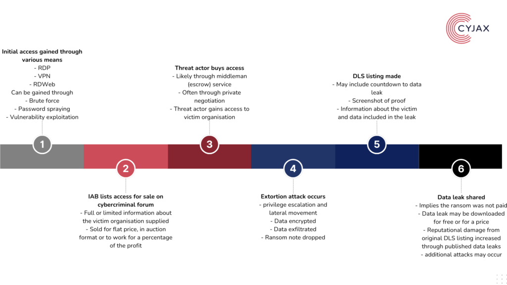 Cyjax monitors and analyses the initial access broker (IAB) market on the most prominent cybercriminal forums. As noted in Cyjax’s 2024 IAB market in review, it is almost certain that extortion groups, APTs, data brokers, and other threat groups use IABs to gain initial access to targeted networks. Though at first glance it is not immediately obvious how important the IAB market is to the threat landscape, Cyjax has conducted a deep analysis of public IAB listings and extortion group DLSs. This analysis examined the speed at which these listings can be used to initiate attack chains and cause damage to organisations in a range of sectors and geographies.