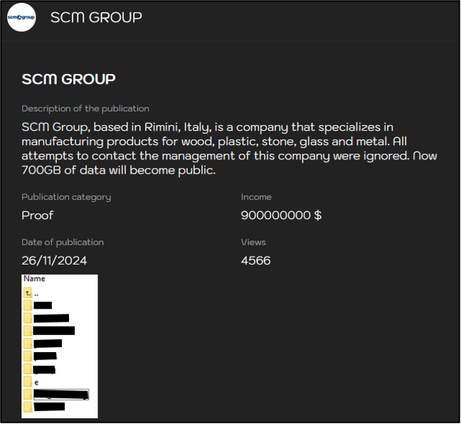 Victim NameSCM GroupOrganisation DescriptionItaly-based manufacturer of machine tools for woodworking.IAB listing usernamePennywise77777Listed priceN/ADate listed on forum21 November 2024Date listed on DLS26 November 2024Extortion groupLynx ransomwareData breach notification?No public notifications observed as of February 2025.Time from IAB listing to DLS listing4 days