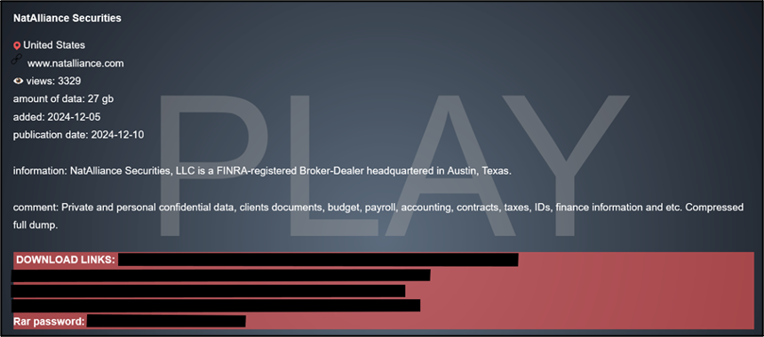 Victim NameNatAlliance SecuritiesOrganisation DescriptionFinancial services organisation based in the United States. IAB listing usernamePennywise77777Listed priceN/ADate listed on forum21 November 2024Date listed on DLS5 December 2024Extortion groupPlay ransomwareData breach notification?No public notifications observed as of February 2025.Time from IAB listing to DLS listing14 days