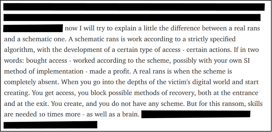 The former member claimed that the skill level required to conduct ransomware operations from beginning to end was “10 times greater” than when purchasing initial access from other threat actors. If this is accurate, it can be assessed that it is comparatively 10 times easier to conduct ransomware operations by purchasing access through the IAB market. This likely appeals to operators and affiliates with fewer technical skills, stricter time constraints, and fewer resources than large, advanced ransomware groups.