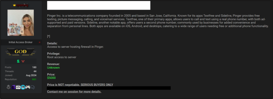 Victim NamePingerOrganisation DescriptionUS-based telecommunications provider, known for its applications Textfree and Sideline.IAB listing usernameMiyakoListed price$5000Date listed on forum1 November 2024Date listed on DLS15 November 2024Extortion groupHellcatData breach notification?No public notifications observed as of February 2025.Time from IAB listing to DLS listing14 days
