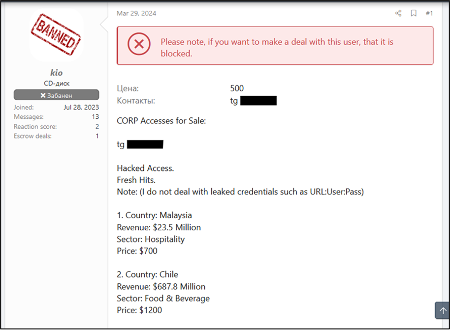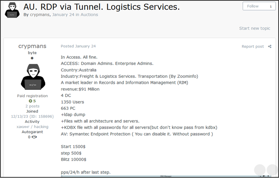 The thread was closed until the broker added a deposit to the forum and there is no public indication of sale for any of the listings. However, several extortion groups have claimed attacks against victims listed in this advertisement on their DLSs.