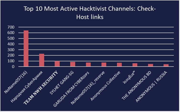 During the last quarter, the Russian hacktivist group NoName057(16) stood out as the most active by a significant margin. Their prominence was gauged based on the number of links they shared to Check-Host reports. Throughout Q1 and into Q2, NoName057(16) consistently issued daily alerts via Telegram, announcing successful distributed denial-of-service (DDoS) attacks against numerous targets. Each post typically highlighted 5-15 specific targets, and the group often made multiple posts per day. Notably, attack notifications were often categorised by country, and occasionally, by the specific organisation. NoName057(16) demonstrated remarkable organisational prowess, unwavering effort, and unmatched consistency within the hacktivist landscape. Given these attributes, it comes as no surprise that they claimed the title of the most active group during the previous quarter.