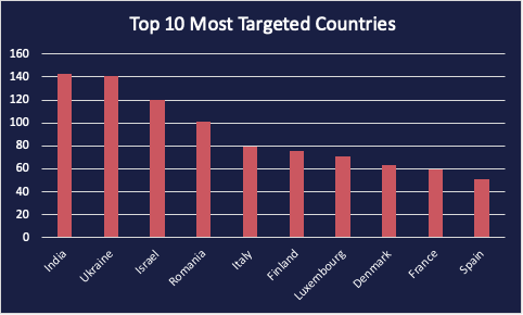 While not immediately evident from the targeted domains, obtaining sector-specific information about organizations can be challenging. However, Cyjax’s analysis reveals that at least 35% of the targeted domains belong to critical national infrastructure (CNI) organizations, and approximately 18% are associated with government entities. This likely reflects hacktivists’ intent to directly respond to government decisions related to social and geopolitical issues during the last quarter. Notably, attacking government organizations requires a higher level of technical sophistication. Interestingly, when compared to financially motivated actors (such as initial access brokers), government organizations appeared in only 4% of listings during Q1 2024. Analysing the top-level domains (TLDs) of the targeted domains featured in the Check-Host links allows analysts to determine the geographical location of the targeted organisations. Figure 1 illustrates the number of Check-Host reports posted by hacktivist Telegram channels, categorised by the countries to which the targeted websites belong.