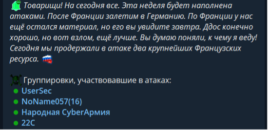 Translation: “Comrades! That's all for today. This week will be filled with attacks. After France we will fly to Germany. We still have some material left on France, but you will see it tomorrow. DDoS is good, of course, but hacking is even better. I think you understand where I'm going with this! Today we kept two of the largest French resources under attack.”