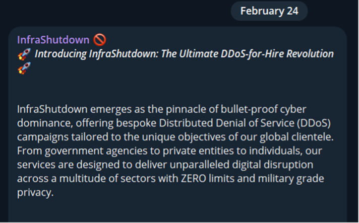 InfraShutdown, another DDoS-as-a-service (DDoSaaS) provider, operates within the hacktivist sphere. The service came to light in February 2024 and was swiftly endorsed by AnonymousSudan. The group even renamed its Telegram channel to “Anonymous Sudan – InfraShutdown,” a name that remains unchanged as of now. Although AnonymousSudan asserts that the service is separate from their group, CYJAX speculates that either AnonymousSudan or one of its members is behind the operation. The sudden promotion of InfraShutdown following its initial emergence and the apparent close relationship between the group and the service contribute to this suspicion, especially when compared to their association with SkyNet.