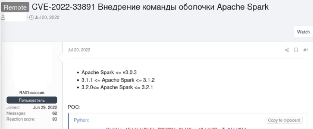 On 18 July 2022, GitHub user W0lfh4cker created a repository containing a PoC for CVE-2022- 33891, a vulnerability affecting the Apache Spark user interface (UI). On 20 July, a user of a Russian-language forum posted a link to this repository, along with further information on the vulnerability. This post generated a significant level of discussion amongst forum users. One of these shared links to two additional PoCs for CVE-2022-33891, which were both created on 19 July.