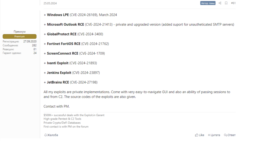 Interestingly, a private implementation of the exploit for CVE-2024-1709 was listed alongside other vulnerabilities in a post on 25 May 2024 by a prominent exploit broker active on a Russian-language cybercriminal forum. This broker did not include a price for the exploit but stated that all listings include “[an] easy-to-navigate GUI and also an ability of passing sessions to and from C2 [sic]”. The patch for the vulnerability was released on 21 February 2024, demonstrating how threat actors continue to consider and exploit the vulnerability months after patches have been released due to the number of devices which go unpatched.