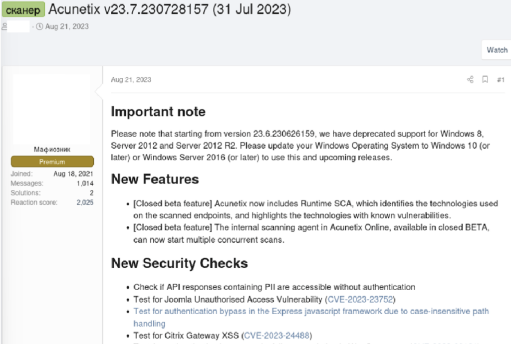 Several other commonly targeted vulnerabilities were discussed on underground forums, particularly in the context of Acunetix, a popular web security scanner. This is a tool which can automate the ability to scan endpoints for known vulnerabilities. Often used as part of a penetration test, these tools allow endpoints to be tested for thousands of vulnerabilities within a short timeframe. This aids in understanding how secure an endpoint is. For cybercriminals, these tools allow them to quickly and efficiently determine which targets they may be able to exploit for their own personal gain, saving them time in the process. Russian- and English-language forums host threads where users can download a cracked version of the scanner. When Acunetix receives a software update, introducing new checks for new vulnerabilities, these threads are updated.