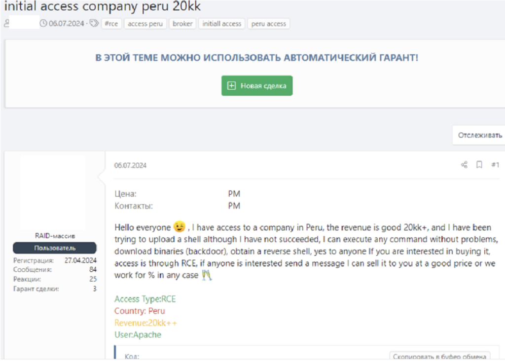 In early June 2024, an IAB advertised access on a prominent Russian-language cybercriminal forum to an unnamed Peru-based organisation with a revenue of over $20 million. This was accessed via remote code execution (RCE) with the user level written as “Apache”. From this information, it is highly likely that the IAB exploited a vulnerability in Apache to gain the ability to execute code remotely.