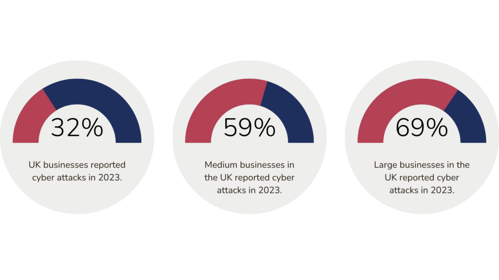 In 2023, 32% of UK businesses reported experiencing a cyber-attack or security breach. This figure rises significantly for medium-sized businesses, with 59% reporting incidents, while 69% of large businesses faced such attacks. These statistics underscore the escalating frequency and scale of cyber threats, making it clear that no organisation, regardless of size, is immune.