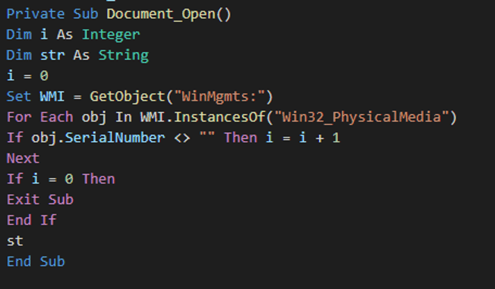 The first part of the macro code uses WMI to check if there are any physical disks present and returns their serial numbers. If a serial number is found, the next function is executed.