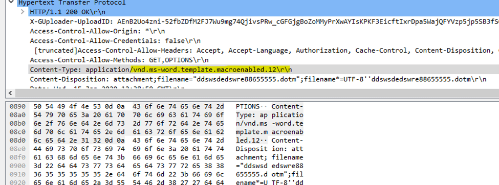 Observing the network traffic as the document is opened, we can see the .docx document loads a template from a remote location (Google Drive, in this case). The template is in .dotm format, meaning that it can contain macros which the lure document will inherit. It is worth noting that this template will be downloaded every time the document is opened, as the .docx cannot have a macro-enabled template saved within it.