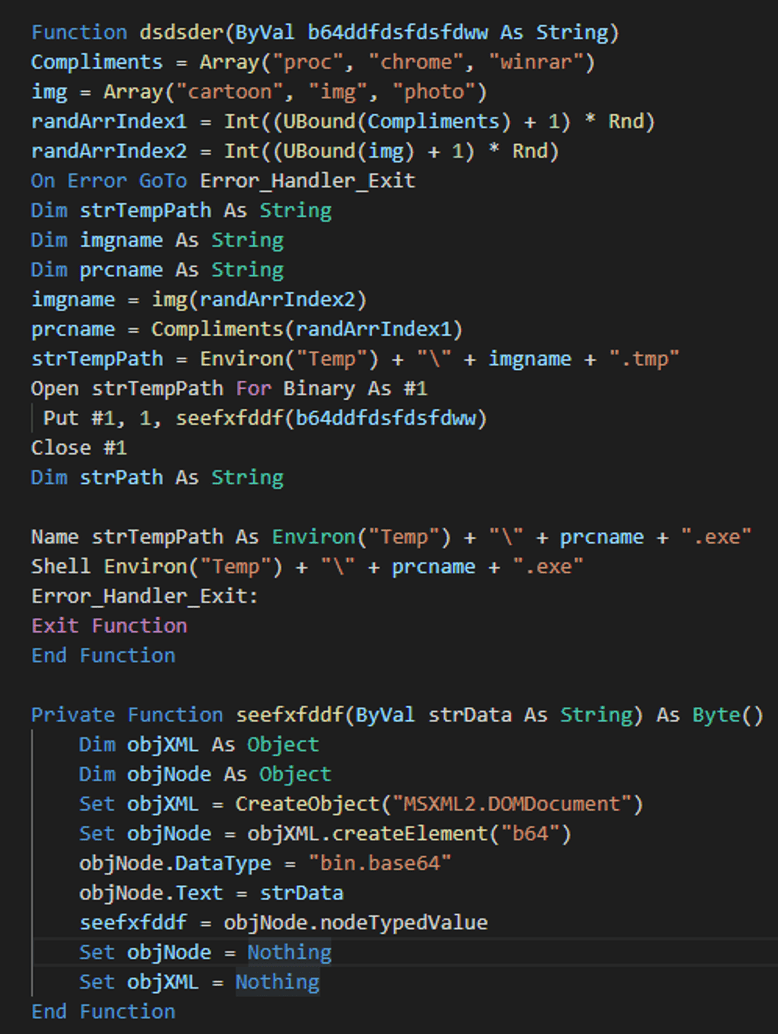 Looking at the reset of the macro code, we can see there is a function which looks for the string “****” in order to find the appended code and a function to decode the Base64, save it as an executable file and finally launch the executable.