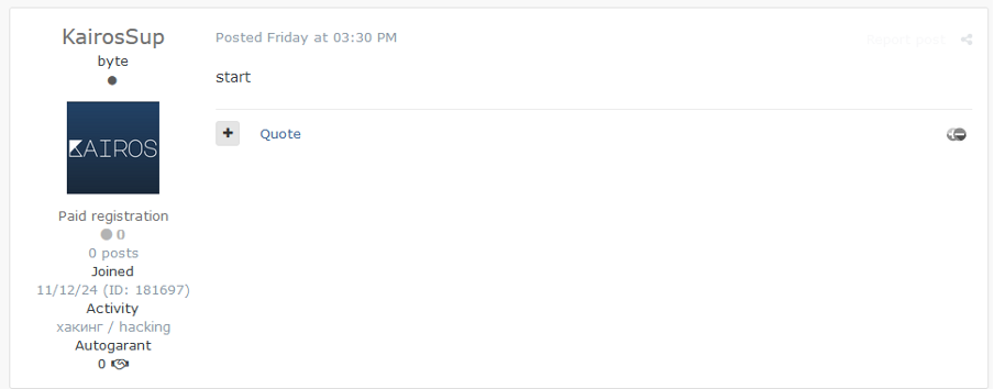 Notably, on 17 November 2024, the IAB responded again to the thread stating that KairosSup did not respond within 24 hours of the auction ending. As such, the access was once again listed for sale. KairosSup joined the forum on 12 November 2024 and has no other recorded activity as of 18 November 2024. Due to the lack of activity, the user has a reputation score of zero.