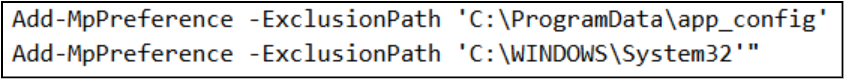 Due to the loop established previously, the setup_helper.exe script runs a second time. It operates identically to the first run, though it appears to continue its execution as the log files are now established. First, the malware attempts to write an exclusion path for the previously extracted app_config folder and the System32 directory from Windows Defender using the following commands.