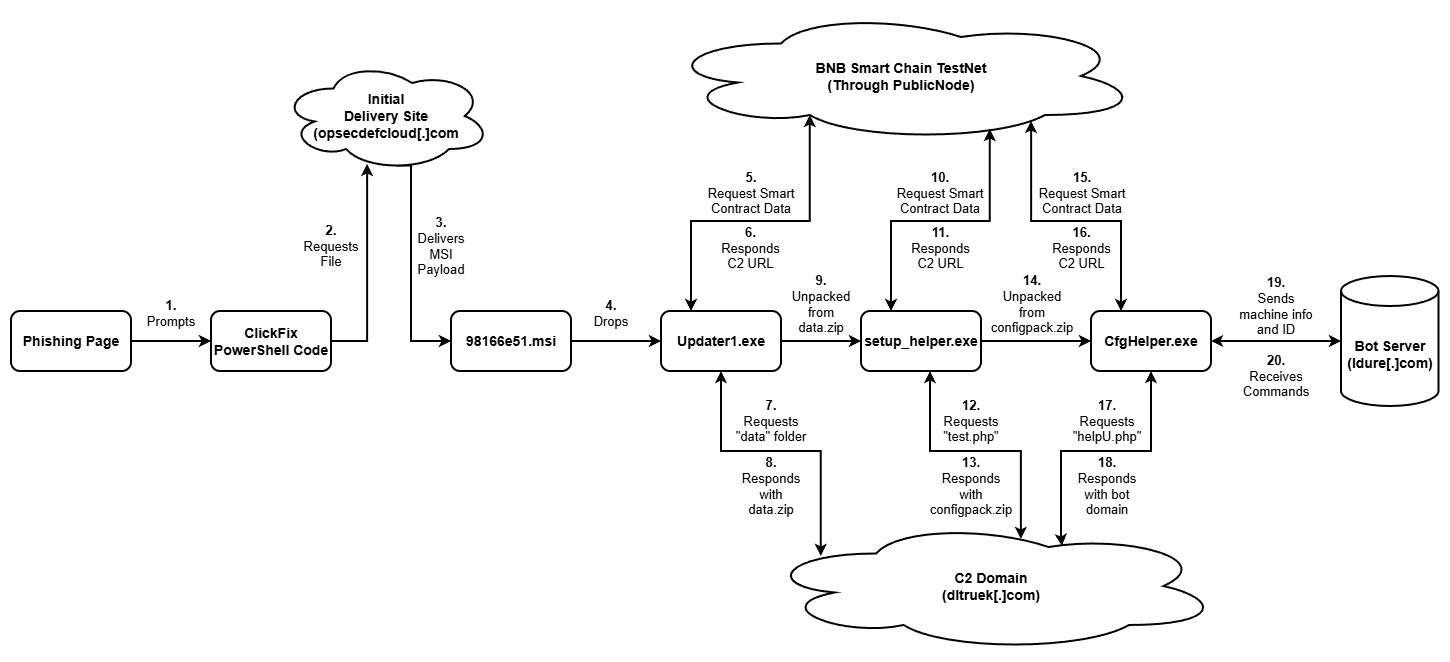 Within this campaign, a unique method to hide the malicious C2 domains was used by the threat actor. This technique is known as EtherHiding and occurs when key information is hidden on blockchains such as Ethereum or BNB through smart contracts. Within this campaign, three pieces of information were hidden via smart contracts. Each of these were then used at a different stage of the malware delivery.