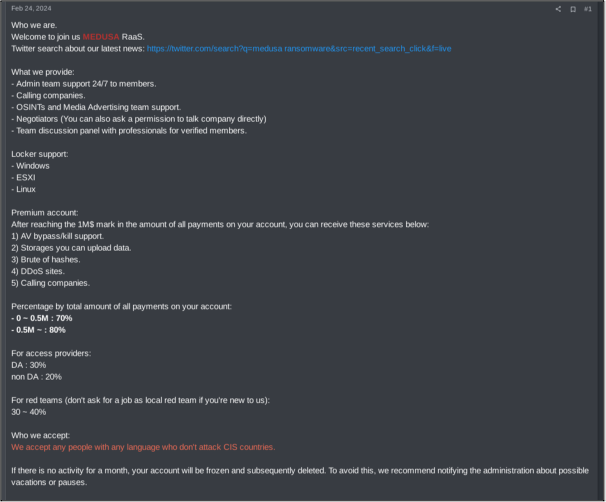 Figure 6 –Medusa’s RaaS affiliate advertisement post.