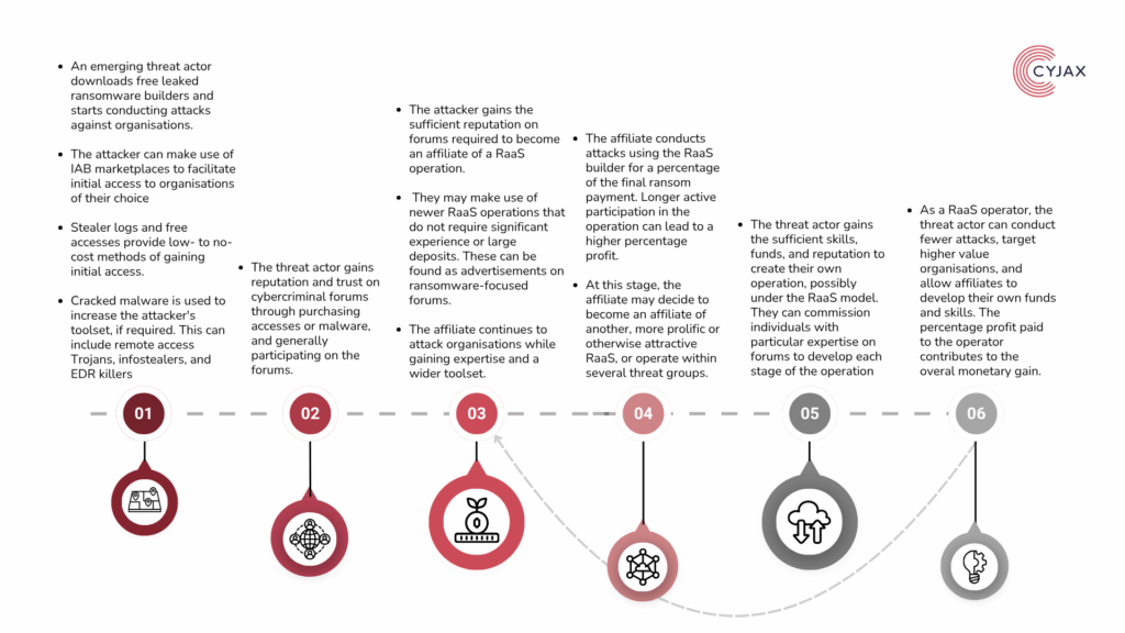 As explored in Cyjax’ blog “Here, There, Ransomware: The Surge of New Ransomware Groups”, ransomware is a business. Employees can find work elsewhere if a company breaks down, goes bankrupt, or no longer offers competitive terms. Alternatively, once they have enough experience, employees may choose to create their own brand and company. When a group does break down or disband, its affiliates often choose to set up their own RaaS group if they have sufficient technical ability and experience. It is here where se groups will nurture the next generation of affiliates. This creates a cycle where more groups are created as threat actors become familiar with how to conduct ransomware operations. These then result in more groups and the cycle continues.