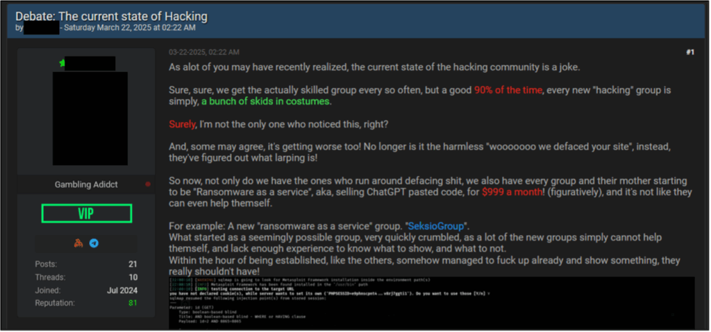 However, this concept has been discussed on another cybercriminal forum. In late March 2025, a user initiated a thread debating the current state of hacking. Here, the user stated that the majority of new hacking groups are “a bunch of skids in costumes” or individuals with low technical capabilities masquerading as sophisticated threat actors. The initial post included the suggestion that many new threat groups use AI-generated code to produce ransomware builders for RaaS operations. This sentiment appears to be shared with other forum members, with one user replying that the state of hacking has become a “playground for script kiddies”. These individuals have been labelled as “inexperienced wannabes who slap together some half-baked code throw on a spooky mask and call themselves a "group."”.