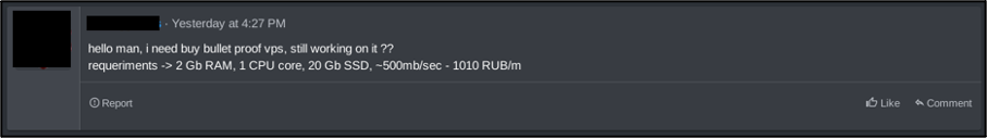 Figure 4 – Forum post by RedLotus requesting bulletproof VPS.