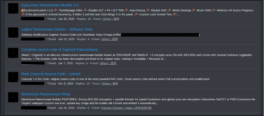 As previously mentioned, ransomware operations traditionally consisted of small, highly capable teams responsible for all stages of the attack chain. This included gaining access, escalating privileges, deploying malware, encrypting files, exfiltrating data, and negotiating a ransom. Additionally, this would also often include the development of tools and malware used in the attack. With the advent of cybercriminal forums, these responsibilities have been separated to allow threat actors with specific expertise to contribute towards attacks without requiring the knowledge of the entire chain. For example, IABs can sell access to organisations for ransomware operations, removing the need for the brokers to conduct extortion attacks. This also removes the need for ransomware threat actors to conduct reconnaissance and gain initial access. Moreover, ransomware developers can sell source code to other threat actors to avoid conducting attacks themselves. Cyjax identified a specific example of in early 2025 across multiple cybercriminal forums.
