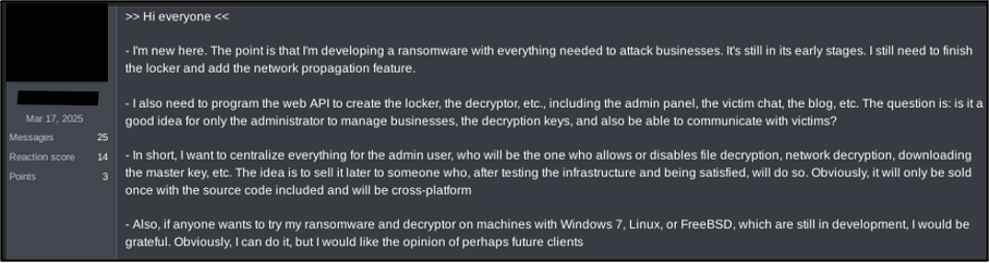 A cybercriminal forum user Cyjax tracks as ‘RedLotus’ has been observed developing a ransomware operation from at least early April to June 2025. RedLotus appears to have technical skills in malware development, having claimed to self-develop a ransomware binary. RedLotus has stated that their aim is create an entire ransomware operation, including a data-leak site (DLS) and admin panel. The user’s final goal is to purportedly sell the entire operation to a threat actor which will conduct the extortion attacks.