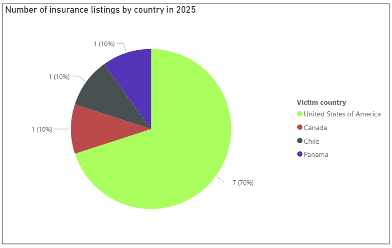 The insurance sector has been targeted in other areas of cybercrime. For example, there have been ten initial access broker (IAB) listings for insurance organisations since the beginning of 2025, seven of which were for organisations in the US. Similarly, there were 19 ransomware data-leak site (DLS) listings for organisations in the sector. This portrays that there was a pre-existing market for cybercrime in this sector, rather than Scattered Spider emerging as a new prominent threat actor targeting the industry.