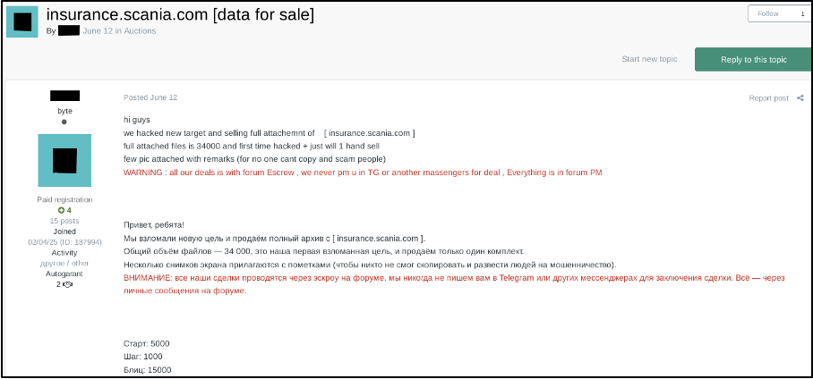 On 12 June 2025, user 'hensi' initiated an English-language thread titled "insurance.scania.com [data for sale]" in the Auctions section of a prominent Russian-language cybercriminal forum. In their initial post on the thread, hensi advertised data belonging to the insurance subdomain of Scania's domain, stating that there were 34,000 attached files and that it was the first compromise on the host. The broker listed the data for $5000 for starting bids, $1000 for subsequent bids, and $15,000 to bypass the auction process.