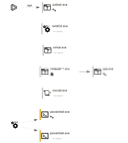As you can see in the above execution graph, the victim opens an email, opens a compressed attachment (using winrar) and then double clicks the script. Wscript.exe then runs the script which spawns PowerShell. The PowerShell is obfuscated to slow down analysis but after reversing the obfuscation we found that it worked in the same way as previous examples, by downloading and executing a payload from a remote host.