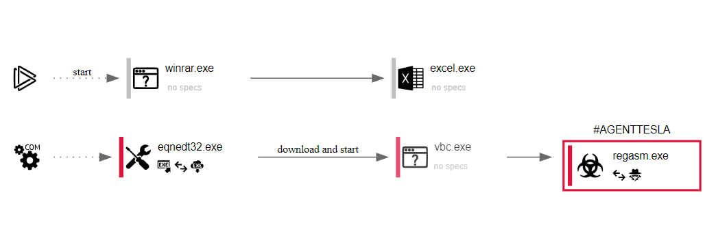 We frequently see this exploit being used to deliver Agent Tesla, Pony and other off-the-shelf stealer malware, even though the flaw was patched in November 2017. This is possibly because builders for this exploit still sell very well on dark web forums.