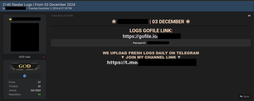 Logs are also often upload to cloud storage and file distribution sites such as gofile.io for easy distribution and avoidance of owned infrastructure detection and attribution. As seen in Figure 9, a forum user has advertised free logs and their Telegram channel which allows access to more logs.