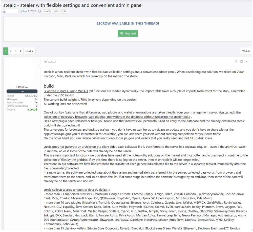 Commodity malware strains are often available for sale on hidden services such as cybercriminal forums and vary widely in capabilities and prices. Notable examples of these strains include Redline and Vidar. Many vendors operate under the Malware-as-a-Service (MaaS) model, in which access to the malware is available on a monthly or yearly subscription basis, with differing levels of access.