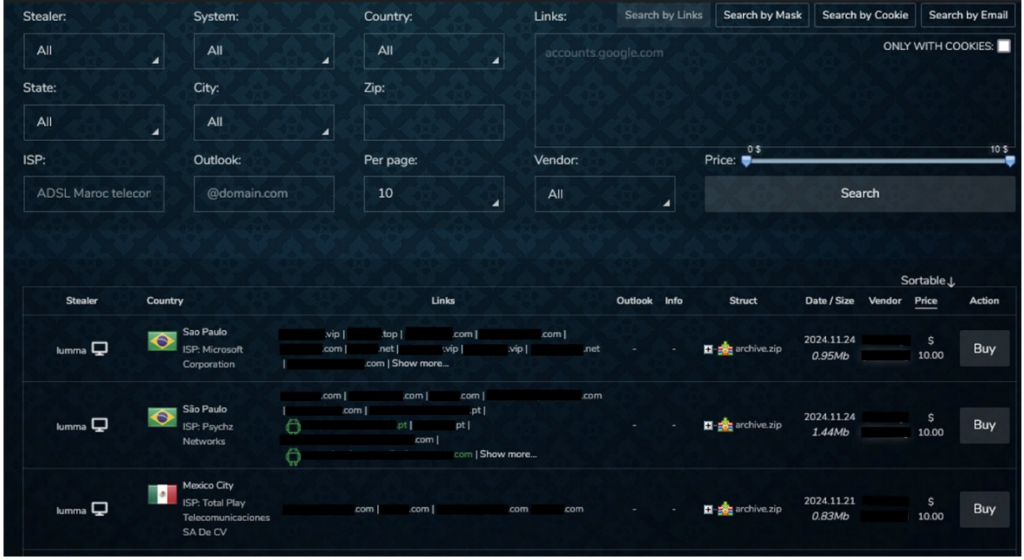 There are both Clearnet and Tor-based sites which are used to host markets for stealer logs. Centralised markets allow users to list logs for sale whilst allowing prospective buyers to use search functions to prove value of sale and potentially increase successful monetary gain. As seen in Figure 5, marketplaces can have highly customisable search settings, allowing visitors to filter for specific logs from particular vendors, malware strains, ISPs, and geolocations.