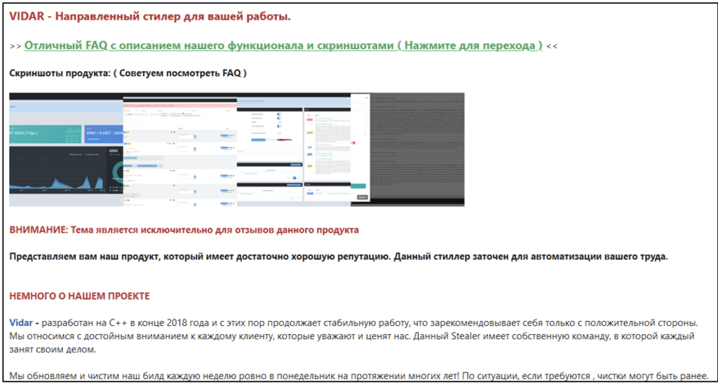 Vidar was developed in C++ at the end of 2018 and has been working steadily since then, which proves itself only on the positive side. We treat every customer with decent attention, who respect and appreciate us. This Stealer has its own team, in which everyone is busy with their own business.