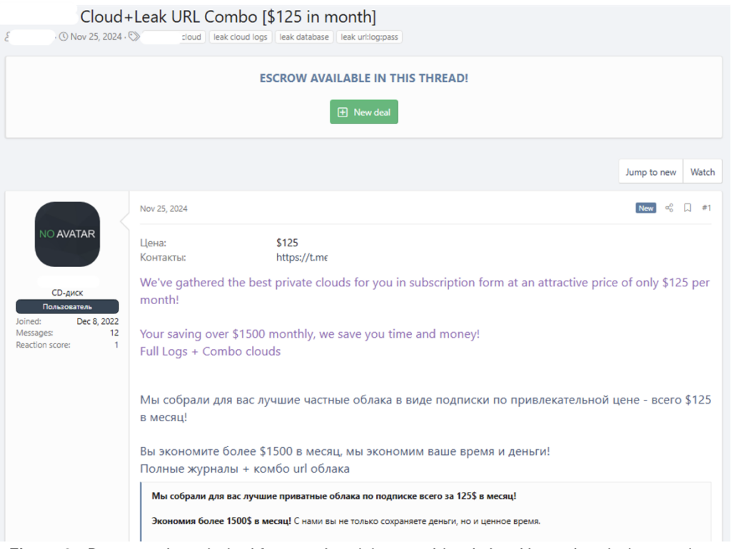As seen in Figure 8, cloud log subscribers may choose to leak or advertise logs to forums behind a credit wall or other subscription cost to increase reputation and monetary gain. However, these are no longer fresh and so there is a lower chance that the logs are active and useful for malicious activity.