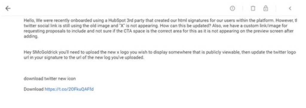 Cyjax analysts identified the mass use of the “t.co” URL shortener to spread malware on Google Groups, which appear to have been distributed by the same entity. Each of the observed phishing All lures in this campaign contain a “t.co” or similarly shortened link, as well as a short identifier string at the end of the content. For example, the below screenshot portrays the initial paragraphs and download link in a Google Groups post.