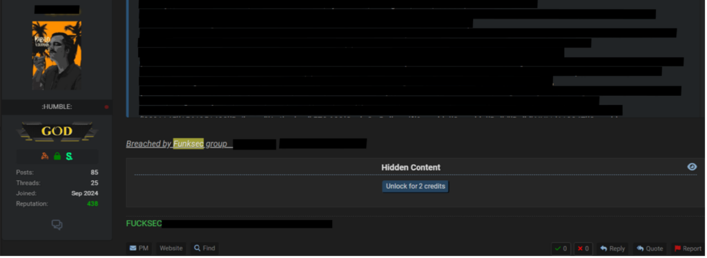 Figure 3 – Screenshot of Funksec breach post on cybercriminal forum
