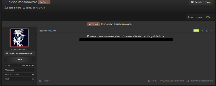 The advertisement was titled “Funksec Ransomware”, indicating that the group’s main motivation is financial gain through victim extortion. It is currently unknown whether the user ‘Scorpionlord’ is a spokesperson of the group, an affiliate, operator, or actively involved in the attacks.