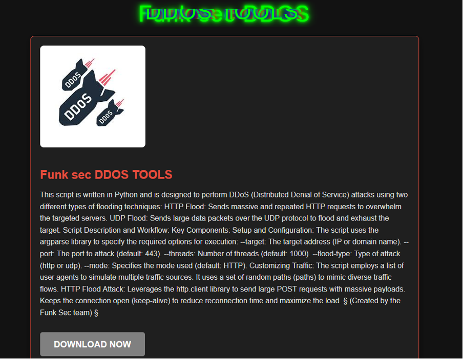 The DDoS tool advertisement leads to a page on the DLS containing a description of the tool, stating that it is written in Python and can be used to conduct DDoS attacks through HTTP and UDP floods. The final sentence in this description states “created by the Funk Sec team”, suggesting that it was developed by the team itself. This is rather than using source code from a similar tool or advertising another threat actor’s tool.